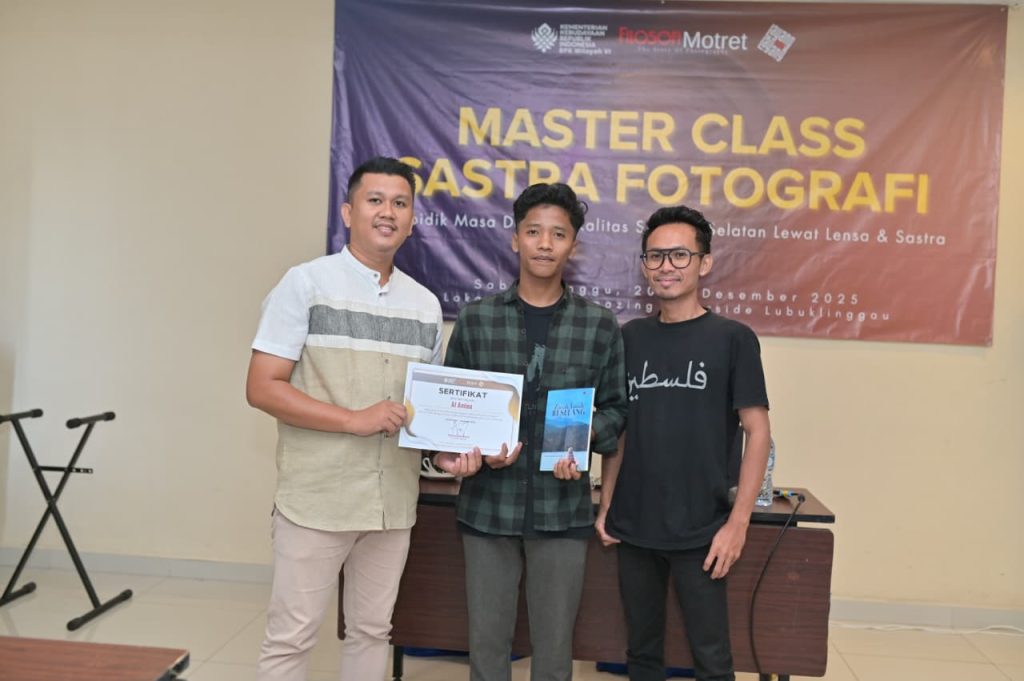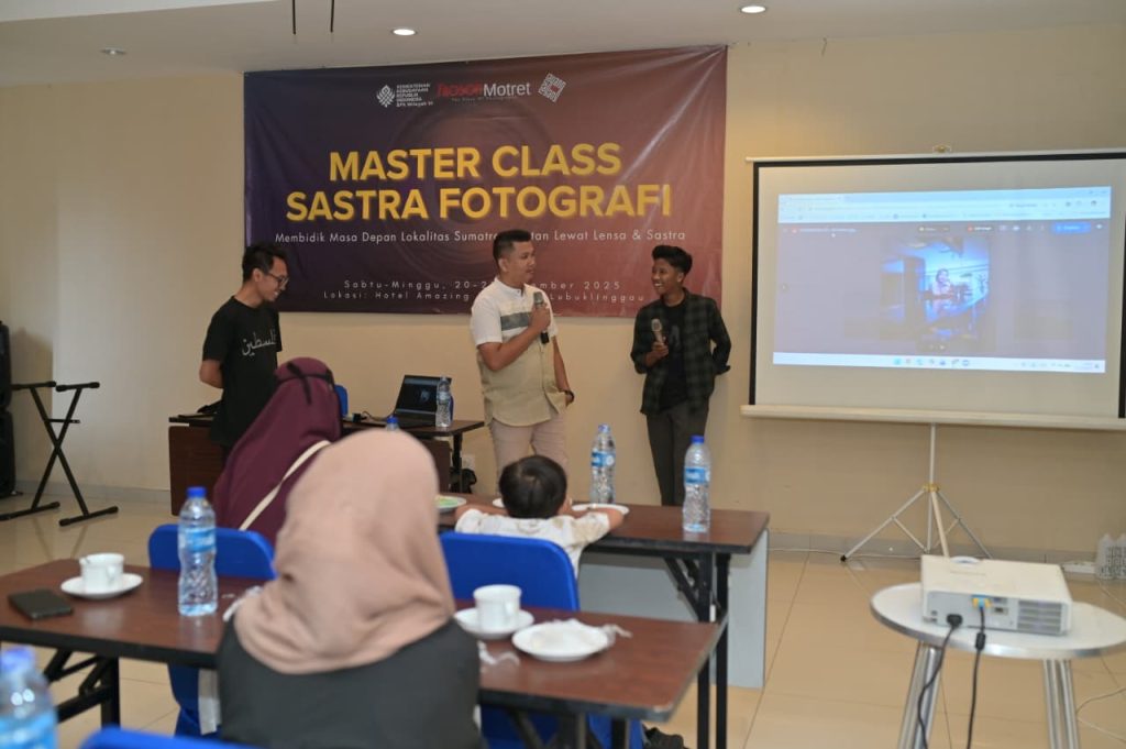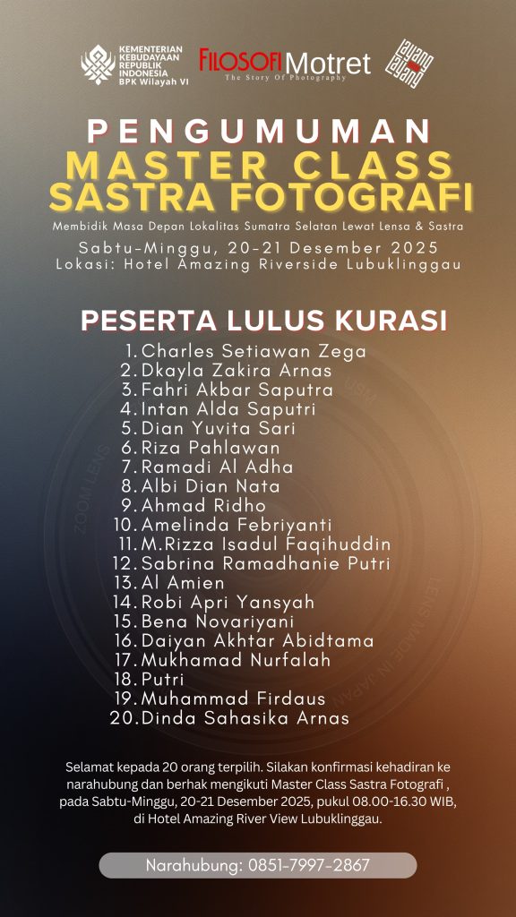 LUBUKLINGGAU – Suasana di Hotel Amazing Riverside, Kota Lubuklinggau, tampak berbeda dari biasanya pada akhir pekan kemarin. Di bawah langit Desember yang teduh, sebanyak 20 peserta terpilih berkumpul untuk menyelami sebuah disiplin ilmu yang unik: Master Class Sastra Fotografi. Acara yang berlangsung selama dua hari, Sabtu dan Minggu (20-21 Desember 2025), ini bukan sekadar pelatihan teknis biasa. Di sini, kamera tidak hanya dianggap sebagai alat penangkap cahaya, tetapi juga sebagai pena yang menuliskan narasi.